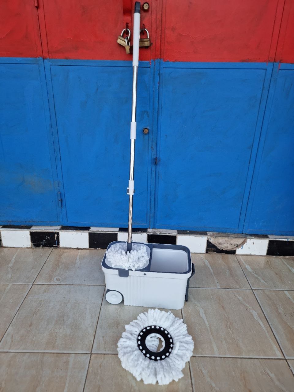 دلو مزدوج بعجلات مع مقبض جرّ قابل للطي لسهولة النقل، وعصا قوية مقاومة للصدأ تتحمل الاستعمال الطويل.